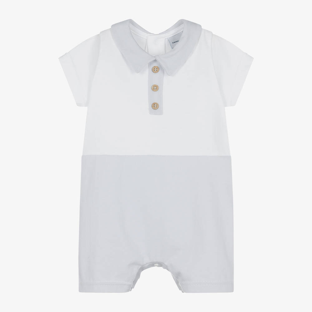 Lovely grey and white shortie for baby boys by Spanish brand, Babidu. Made in soft cotton jersey, it has a pointed collar and neutral, decorative buttons on the front. There are poppers on the back and between the legs to help with easy dressing.