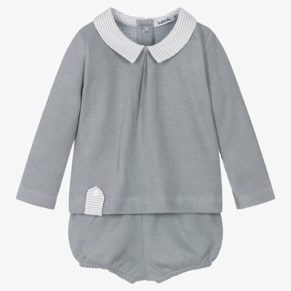 Grey shorts set for baby boys by Spanish brand Babidu, made in a soft and stretchy cotton knit. The long-sleeved top has a striped collar and a matching button tab on the hem for a decorative touch. There are popper fastenings on the back for easy dressing. The matching shorts have a stretchy waistband and elasticated legs to ensure a comfortable fit and feel.