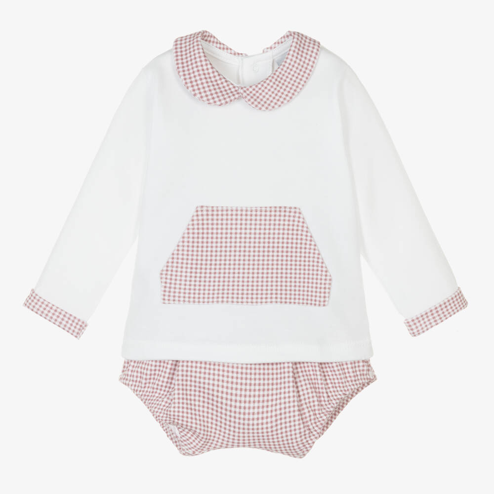 A sweet cotton jersey top and shorts set for baby boys by Spanish brand Babidu. The white top has a gingham Peter Pan collar, pouch pocket and sleeve cuffs in maroon red. It fastens easily with poppers on the back. The matching bubble shorts have a gently elasticated waist, with decorative wooden buttons on the front for a classic finish.