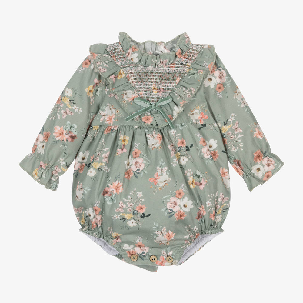 In sage green with a vintage pink floral print, this delightful shortie for baby girls is by Spanish brand Babidu. The long sleeves have sweet frilly cuffs, and the shirred chest panel is trimmed with a pretty ruffle and a velvet ribbon bow. Woven in soft cotton twill, the babysuit is fully lined for comfort, with wooden button fastenings on the back and between the elasticated legs.