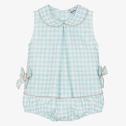 Charming pink shorts set for baby girls from Babidu. Made in softly knitted cotton jersey with a cosy brushed feel inside, it has a traditional, smocked white ruffle collar with matching ruffles on the cuffs. It pairs with sweet matching shorts, pull-up in style with elasticated trims.
