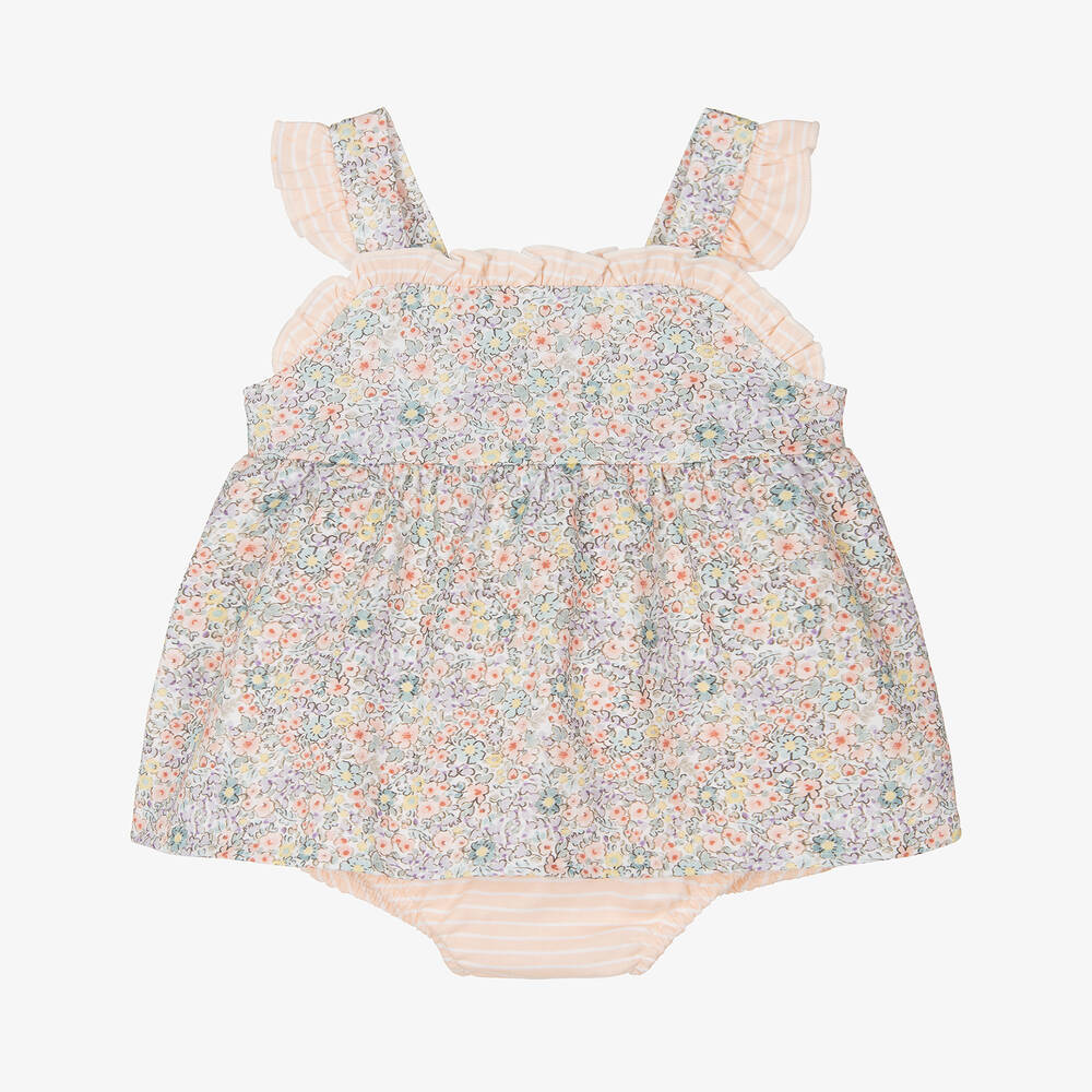 Adorable cotton dress for baby girls by Babidu, with a floral pattern in shades of pink, blue, green and lilac. Made in soft and comfortable jersey, it has ruffle trims in contrasting pastel orange stripes. There are popper fastenings on the back and it comes with matching, striped knickers, gently elasticated for comfort.