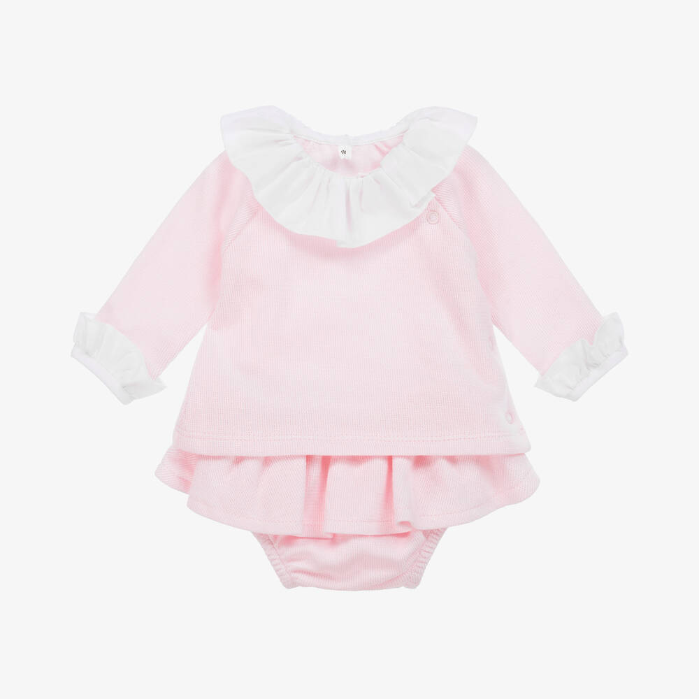 A lovely pale pink shorts for baby girls by Spanish brand Babidu. Both pieces are made in a soft cotton jersey knit, with a cosy fleecy inside. The top has a pretty ruffle collar in white, with matching frilly trims on the cuffs. To help with dressing, there are easy-fastening poppers on one of the raglan sleeves. The coordinating shorts have a jersey knit ruffle trim, with a gently elasticated waist for comfortable wear.