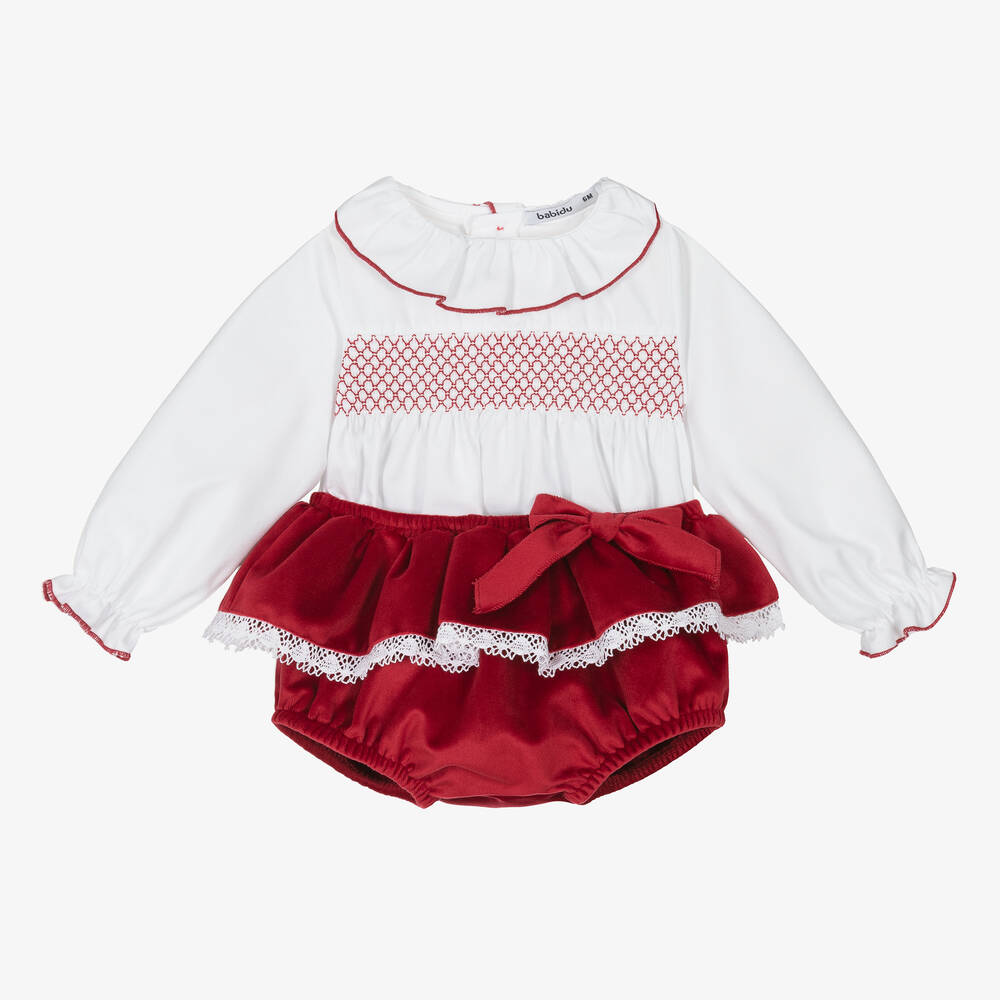 A traditionally styled top and shorts set for baby girls by Spanish brand Babidu. Made in soft cotton twill, the white blouse has lovely red smocking detail across the chest, with a pretty ruffle collar and frilly cuffs on the long sleeves. There are wooden button fastenings on the back. The red velvet shorts have a gorgeous ruffle trim, edged in delicate white lace, and decorated with a beautiful bow on the front. They are gently elasticated around the waist and legs for comfortable wear.