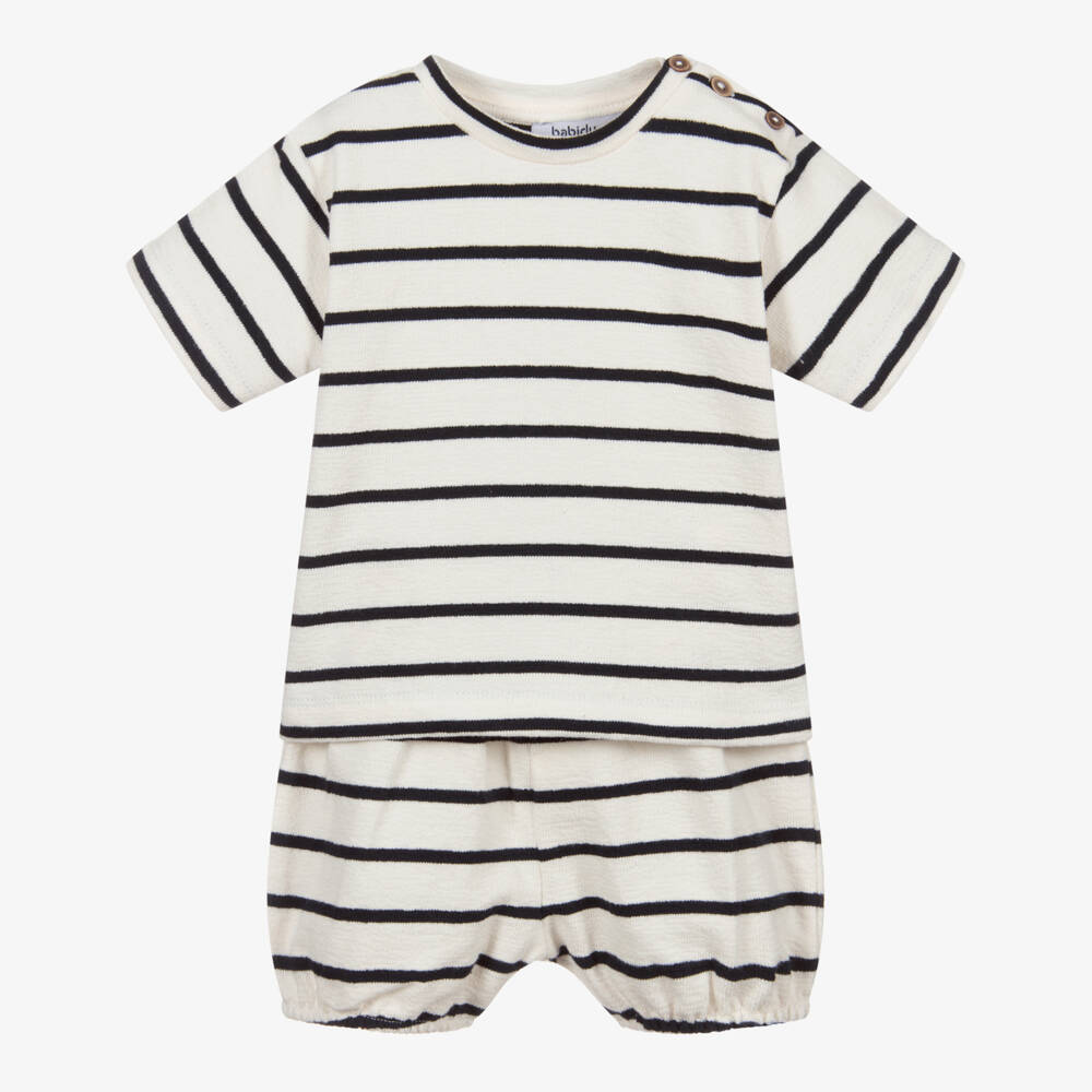 Baby boys natural beige and navy blue striped shorts set by Babidu. Made in mid-weight cotton jersey, which is soft and stretchy, this sweet outfit has buttons on one shoulder and the matching shorts have an elasticated waistband.