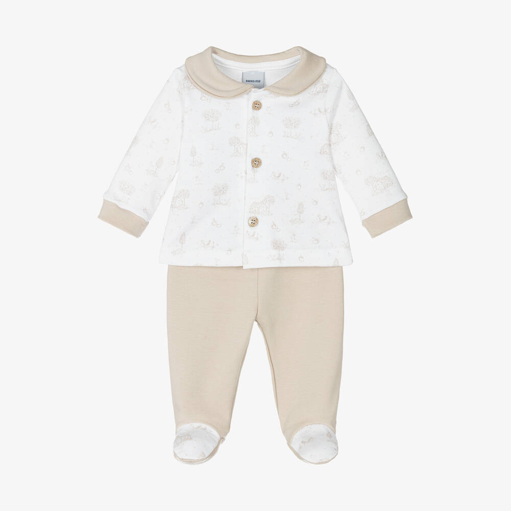 Lovely white and beige two piece babygrow for little boys and girls by Babidu, made in soft cotton jersey. The button-fastening top half has a cute rounded collar and sweet farmhouse and orchard print. Matching bottoms complete the neutral look.