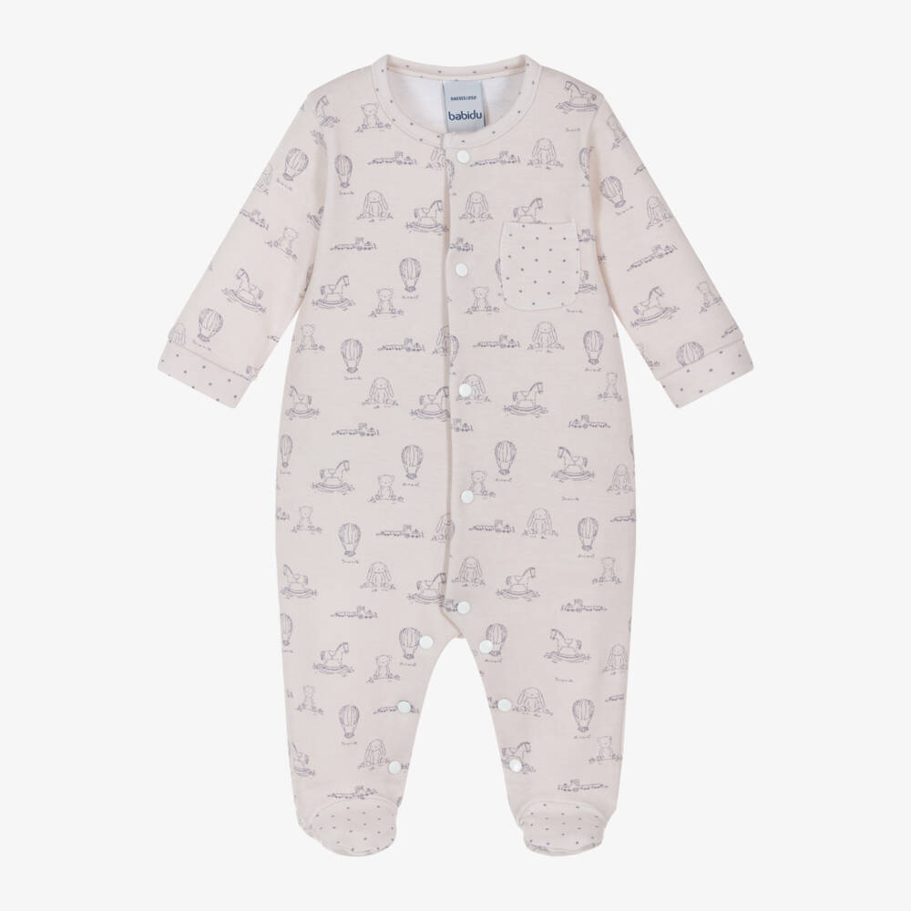 Beige babygrow for boys and girls by Spanish brand Babidu, made in soft cotton jersey. Gentle against delicate skin, it has a cute grey nursery toy print featuring bunnies, teddy bears and rocking horses. There is a little patch pocket on the chest with a contrast grey dot pattern, matched by the trims on the collar, cuffs and feet. This lovely babysuit fastens with poppers on the front and between the legs.