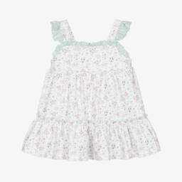 Girls navy blue and ivory striped cotton dress by Babidu. This pretty design has a white ruffle collar and a v-shaped back. There are faux wooden back button fastenings and a large fixed bow.