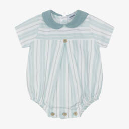 Cute pale blue cotton shortie for baby boys and girls by Babidu, made in soft waffle jersey. This charming piece features a woven Peter Pan collar with subtle stripes and a sweet smocked detail on the chest. Ideal for warmer days, this shortie ensures comfort with its lightweight fabric and practical popper fastenings, offering both style and convenience.