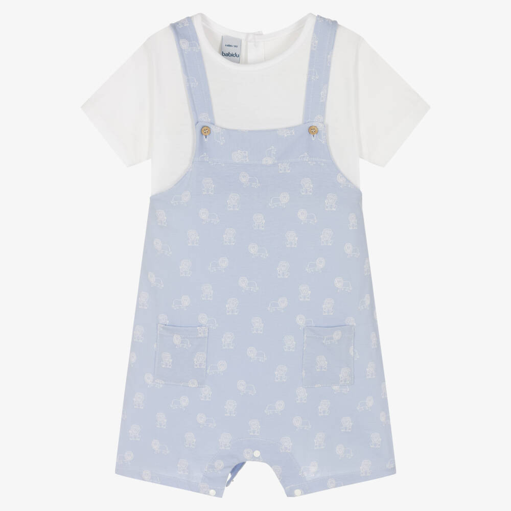 Younger boys pale blue and white dungaree shorts set by Spanish brand Babidu, made in soft, comfortable cotton jersey. The dungarees have a cute white lion print, with button straps and useful popper fastenings underneath. The matching T-shirt also secures with poppers on the back for easy dressing and completes this lovely casual outfit.
