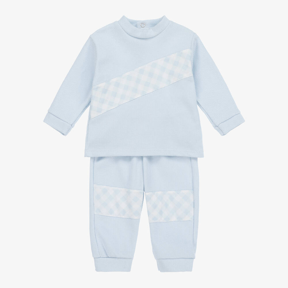 A lovely pale blue trouser set for little boys by Spanish brand Babidu. Cosy and comfortable, it is made in a soft cotton jersey knit, with a warm fleecy inside. The top has a gingham check panel diagonally across the front, with easy fastening poppers on the back. The trousers have matching check trims on the knees, with a gently elasticated waist for comfort and easy pull on.