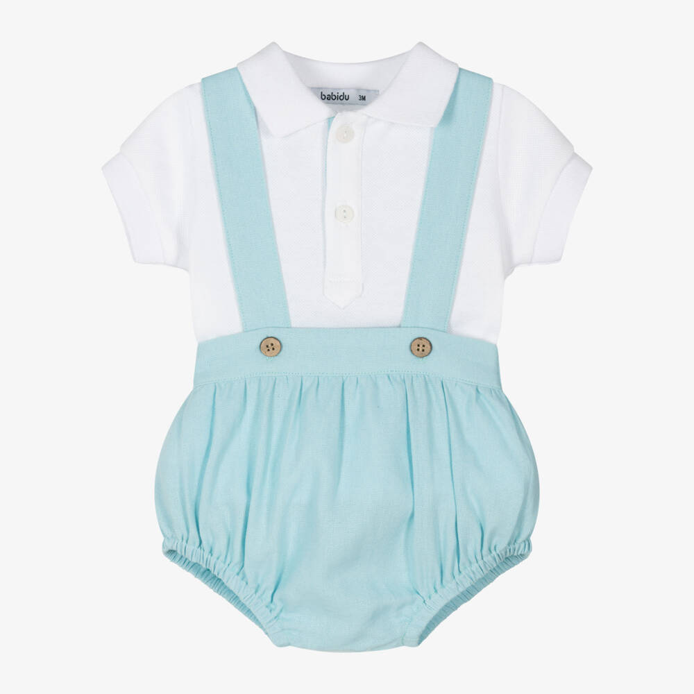 A lovely shorts set for little boys by Spanish brand Babidu. The white cotton short-sleeved polo shirt is made in stretchy piqué, with a ribbed collar and front button placket. The traditionally styled shorts are woven in a soft linen blend and are gently elasticated around the waist and legs. They have fixed braces, secured with wooden buttons on the front.