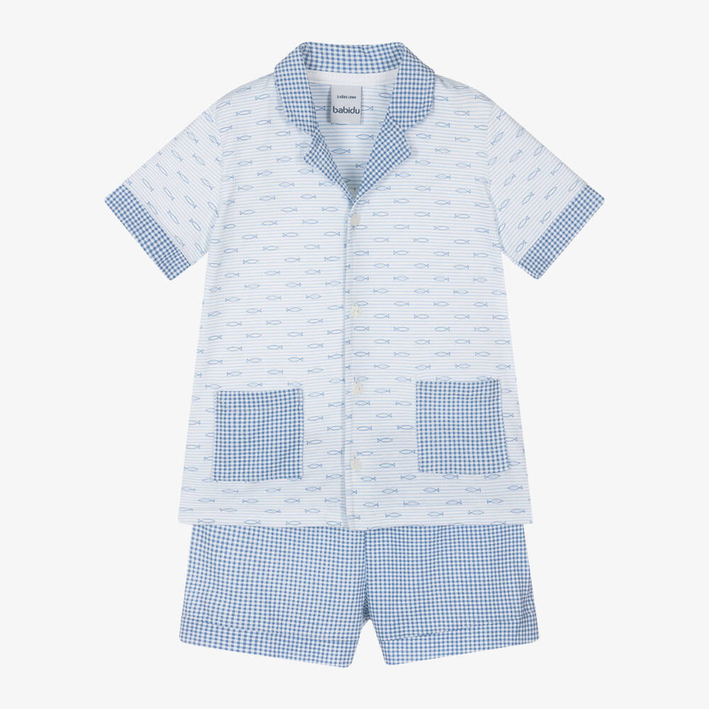 Blue and white short pyjamas for boys by Babidu, made from super soft cotton jersey with a striped fish design. In a cute style for bedtime, the button-up shirt has a gingham revere collar and coordinating front pockets. A pair of shorts with a comfortable, stretchy, elasticated waist and gingham trims complete the look.