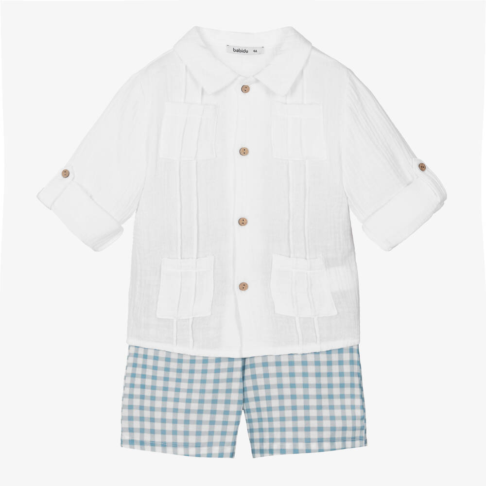 A charming, traditionally styled white and blue cotton shorts set for boys by Babidu. Made in super soft cheesecloth, the shirt has pintucks on the front, four cute patch pockets, and wooden beige buttons to fasten the front and cuffs. The long-sleeves can be rolled up and secured with button tabs for a more casual style. The lightweight blue and white gingham shorts have a classic flat front with slanted pockets and a partly elasticated waist with an adjustable strap on the inside for a good fit.