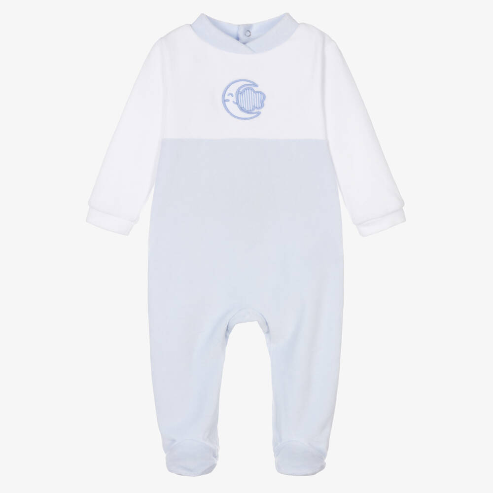 Adorable pale blue and white cotton babygrow for boys by Babidu, made in soft velour. Comfortable and cosy, this lovely babygrow has a sweet moon and cloud motif embroidered on the front in blue. It fastens on the back and between the legs with easy-to-use poppers for quick dressing.