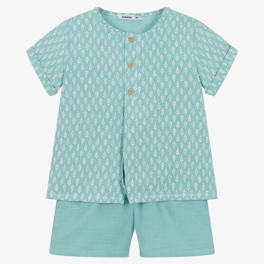 In a lovely shade of sea green, this classically styled top and shorts set for boys is by Babidu. Patterned in a white leafy print, the collarless shirt has turned up cuffs and traditional wooden button fastenings down the front. The shorts have useful front pockets, with a decorative button tab on the gently elasticated waist. Soft and comfortable, both pieces are made in lightweight cotton cheesecloth.
