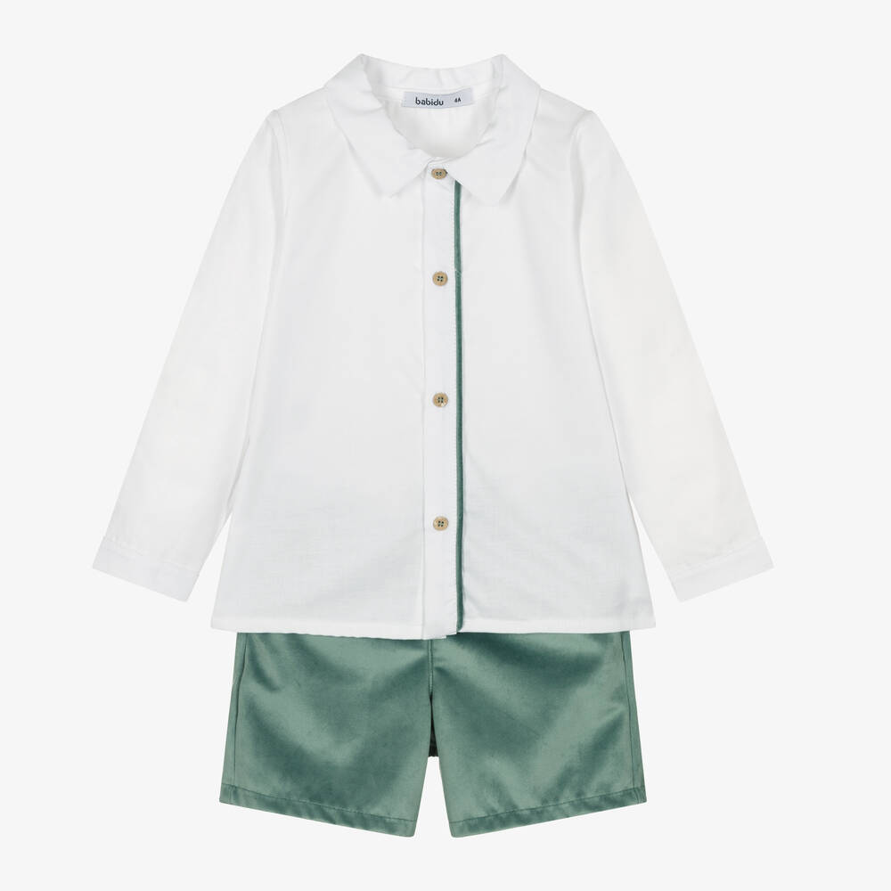 A traditionally styled shirt and shorts set for boys by Spanish brand Babidu. Made in luxuriously soft velvet, the green shorts have front pockets and a partly elasticated waist for a comfortable fit. The white cotton twill shirt has a smart pointed collar and wooden button fastenings, with green velvet trim down the front placket to complete the classic look.