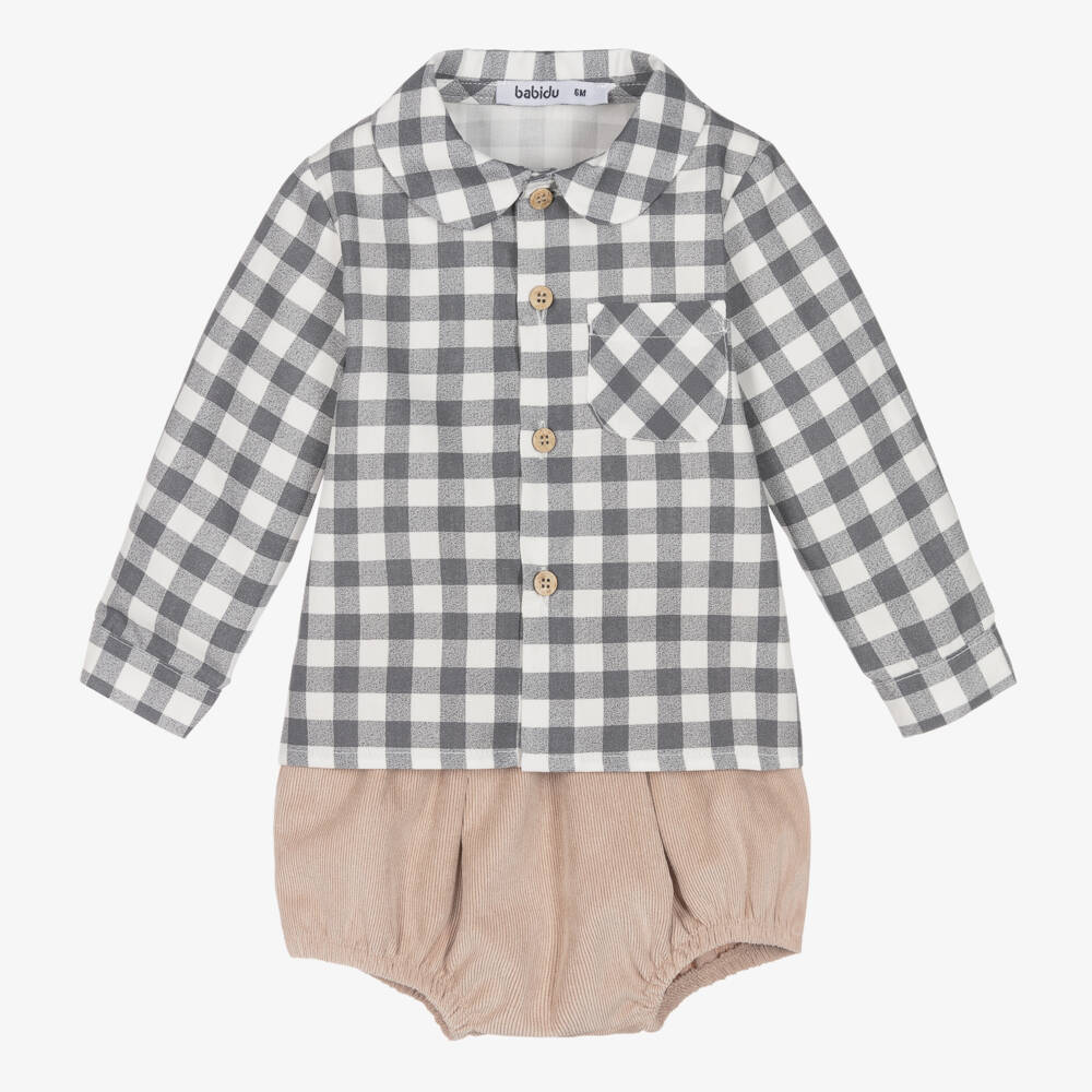 A grey, white and beige shorts set for little boys by Spanish brand Babidu. The cotton poplin shirt has a check pattern, a Peter Pan collar and a chest pocket for traditional styling. It fastens with buttons on the front and has matching decorative buttons on the needlecord shorts.