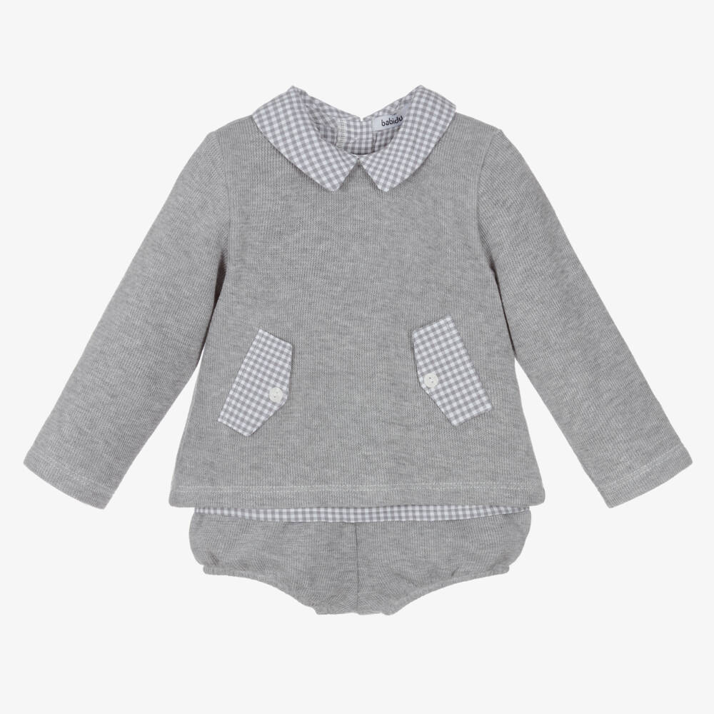 Cute grey shorts set for little boys, by Babidu. Knitted in lightweight cotton, the sweater has sweet gingham faux pockets, and useful poppers on the back. It comes with a grey gingham top with a traditional pointed collar, and matching grey knitted shorts.