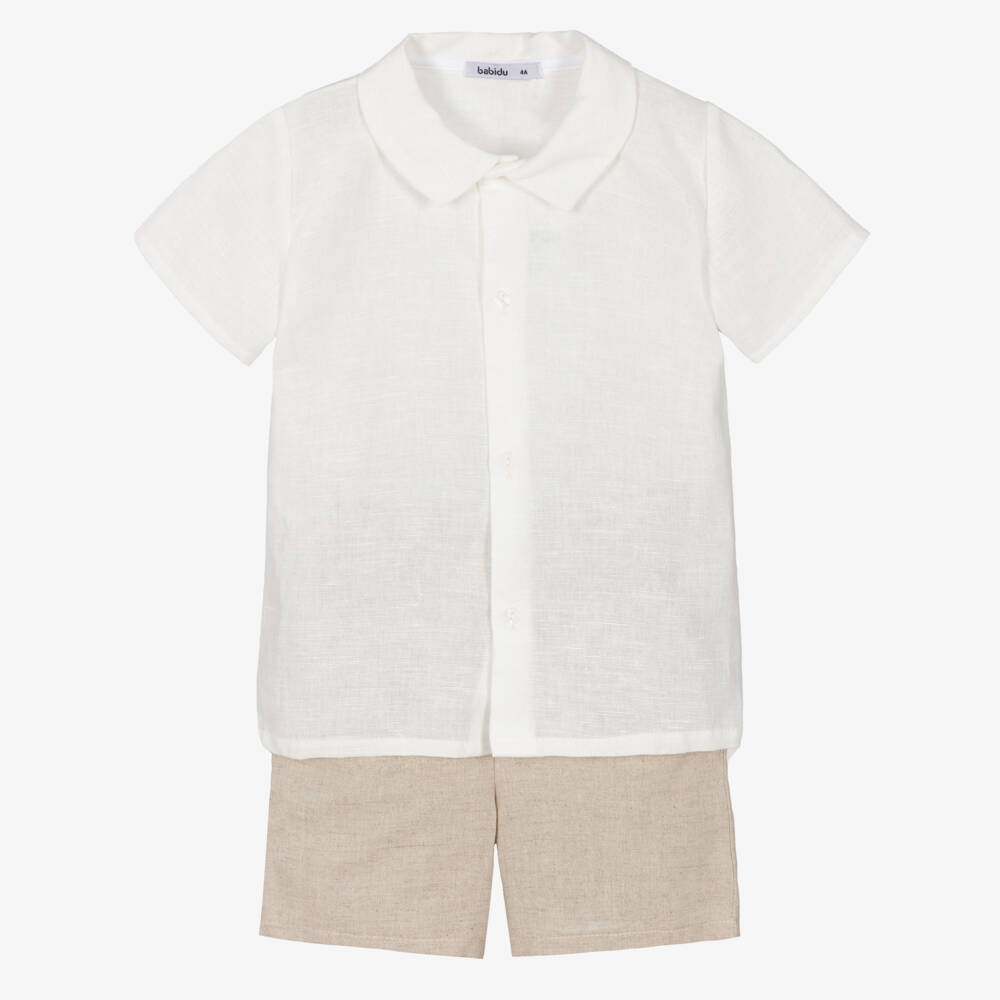 Smart-casual off-white and beige shorts set by Spanish brand Babidu. Understated and traditionally styled, it is made in lightweight cotton with a linen look. The short-sleeved shirt fastens with buttons on the front. Simply pull-up, the waistband of the easy-to-wear shorts is elasticated around the back and they have slanted side pockets.