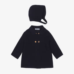 A softly knitted navy blue coat and hat set for little boys by Babidu, offering cosy comfort and lightweight warmth. The coat has a smart pointed collar and double-breasted wooden button fastenings. The matching bonnet secures under the chin with a knitted buttoned strap.