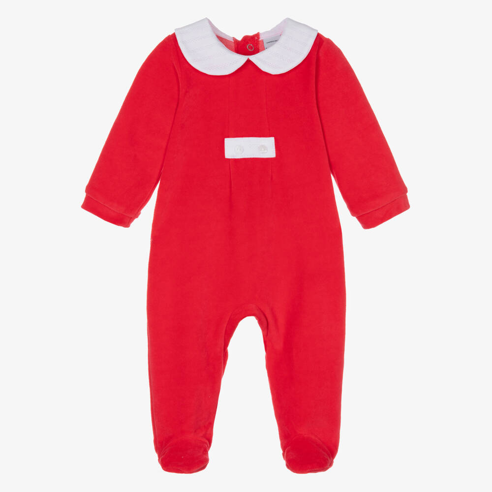 Made in soft velour, this red cotton babygrow for boys is by Spanish brand Babidu. Comfortable against delicate skin, it has a contrast white cotton Peter Pan collar, with a matching decorative white trim and buttons on the chest. It fastens on the back and between the legs with poppers for quick and easy dressing.