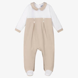 In white and beige, this cosy and comfortable babygrow for boys is by Babidu. Made in soft cotton jersey, it has a smart collar and pleats with button detailing on the front. It fastens with poppers on the back and between the legs for easy changing.
