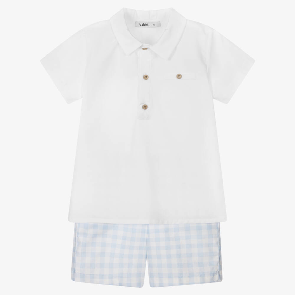 Smart-casual white and blue shorts set for boys by Babidu, made in lightweight cotton poplin. The white short sleeve shirt fastens with wooden buttons on the front and has a faux chest pocket for a traditional finish. The gingham checked shorts have an elasticated waist for a comfortable fit and easy dressing.