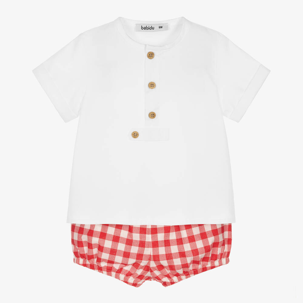 Casual and comfy for little boys, this lightweight cotton top and shorts set is by Babidu. The white shirt is in a collarless style and fastens with traditional wooden buttons on the front. The bubble shorts are in a classic red and white gingham check. They have little front pockets and are gently elasticated around the waist and legs.