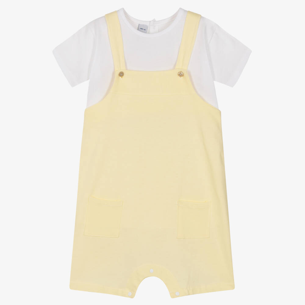 Younger boys yellow and white dungaree shorts set by Spanish brand Babidu, made in soft, comfortable cotton jersey. The dungarees have button straps and useful popper fastenings underneath. The matching T-shirt also secures with poppers on the back for easy dressing and completes this lovely casual outfit.