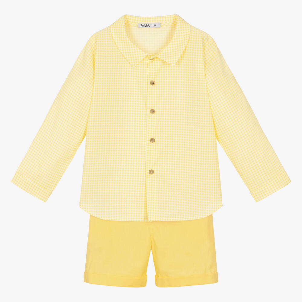In a lovely shade of bright yellow, this cotton shirt and shorts set for boys is by Babidu. The gingham shirt has a smart pointed collar and traditional wooden buttons for fastening. The shorts have slanted hip pockets and turn-up hems. They fasten with a zip and matching button, and are partly elasticated around the waist for a comfortable fit.