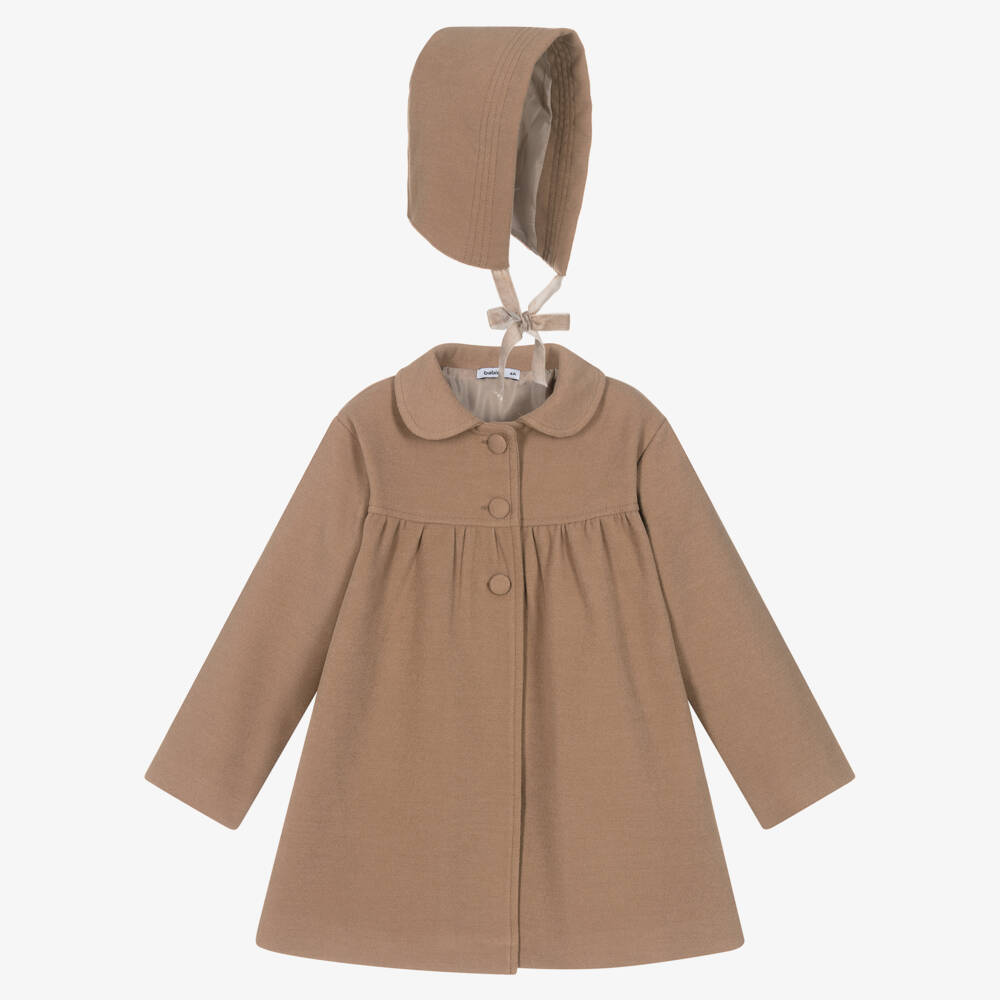 Smart beige coat and hat set for girls by Spanish brand Babidu, made in a soft wool-feel fabric. The traditionally styled coat has a single breasted button fastening and a classic Peter Pan collar. It is lined in silky satin for a luxurious feel. A sweet matching bonnet, which secures with velvet ribbon ties under the chin, completes the look.