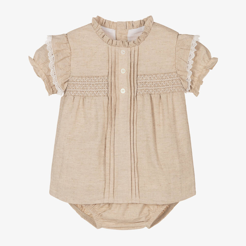 Lovely beige dress for little girls by Babidu, softly woven in a linen and cotton blend. This traditional, puff sleeve dress has guipure lace flutters on the shoulders, a smocked panel across the bodice and pintuck pleats. Lined in soft cotton voile for gentle comfort, it fastens with buttons on the back for a classic look. Matching elasticated knickers complete the pretty look.