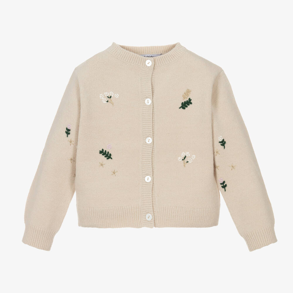 Beige cardigan for girls by Babidu, with beautiful floral embroidery in white, green and sparkly gold. Made in a beautifully soft knit with a touch of wool, it has long sleeves, ribbed trims and fastens with pearlised white buttons on the front.