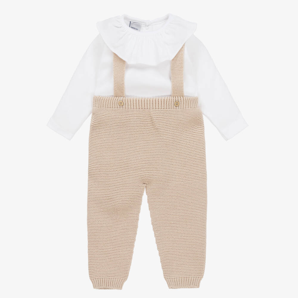 Beige trouser set for little girls by classic Spanish brand Babidu. The white bodysuit is made in comfortable cotton jersey, with a large, ruffled collar. It fastens with poppers on the back and between the legs, so always looks tidy and never becomes untucked. The navy blue, softly knitted trousers have cross-over shoulder straps that fasten with buttons and have ribbed trims for cosiness.