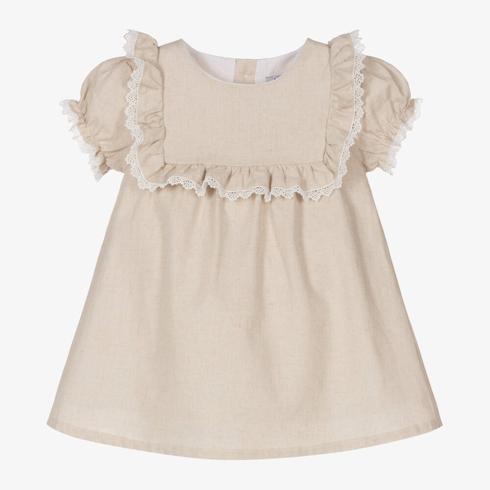 Gorgeous beige dress for girls by Spanish designer, Babidu. Softly woven in a linen and cotton blend, this puffed short-sleeved dress has a ruffle-trimmed bib front and timeless, ivory guipure lace trims. It is lined in soft cotton for gentle comfort and fastens with ivory buttons on the back.