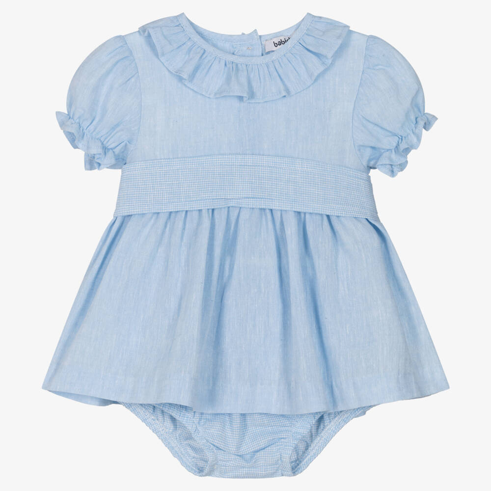 Adorable blue cotton dress for little girls by Babidu, made in soft and lightweight cotton. A classic look, it has a sweet ruffle collar and puffed sleeves with elasticated ruffle cuffs. There is a fixed sash tie in contrasting fine houndstooth check, that fastens in a pretty bow on the back. The dress fastens with buttons and comes with matching elasticated knickers.