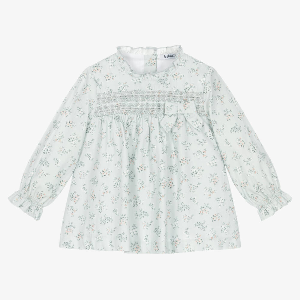 A sweet pale blue dress for little girls from Babidu, with a lovely floral pattern in shades of blue and pink. A traditional look, the dress is made in lightweight cotton twill with smocking on the bodice and a cute little bow detail. Ruffle trims on the collar and elasticated cuffs give a pretty finish, and the dress fastens with buttons on the back. Lined in lightweight cotton for comfort, it comes with matching elasticated knickers to complete the look.