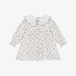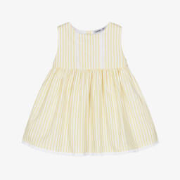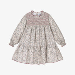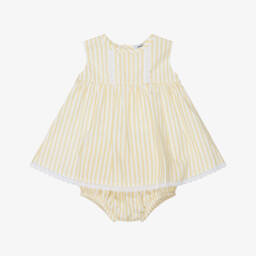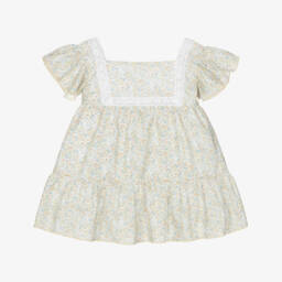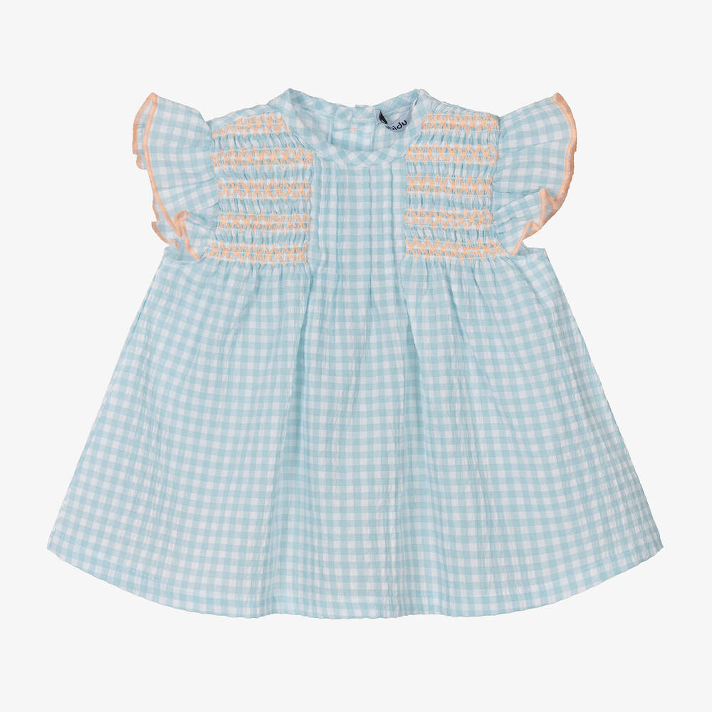 Turquoise blue dress for little girls by Babidu, softly woven in cotton seersucker. Patterned in an adorable gingham print, this flutter sleeve dress has bright coral orange smocking on the bodice for a timeless look and button fastenings on the front. Matching elasticated knickers complete this pretty look.