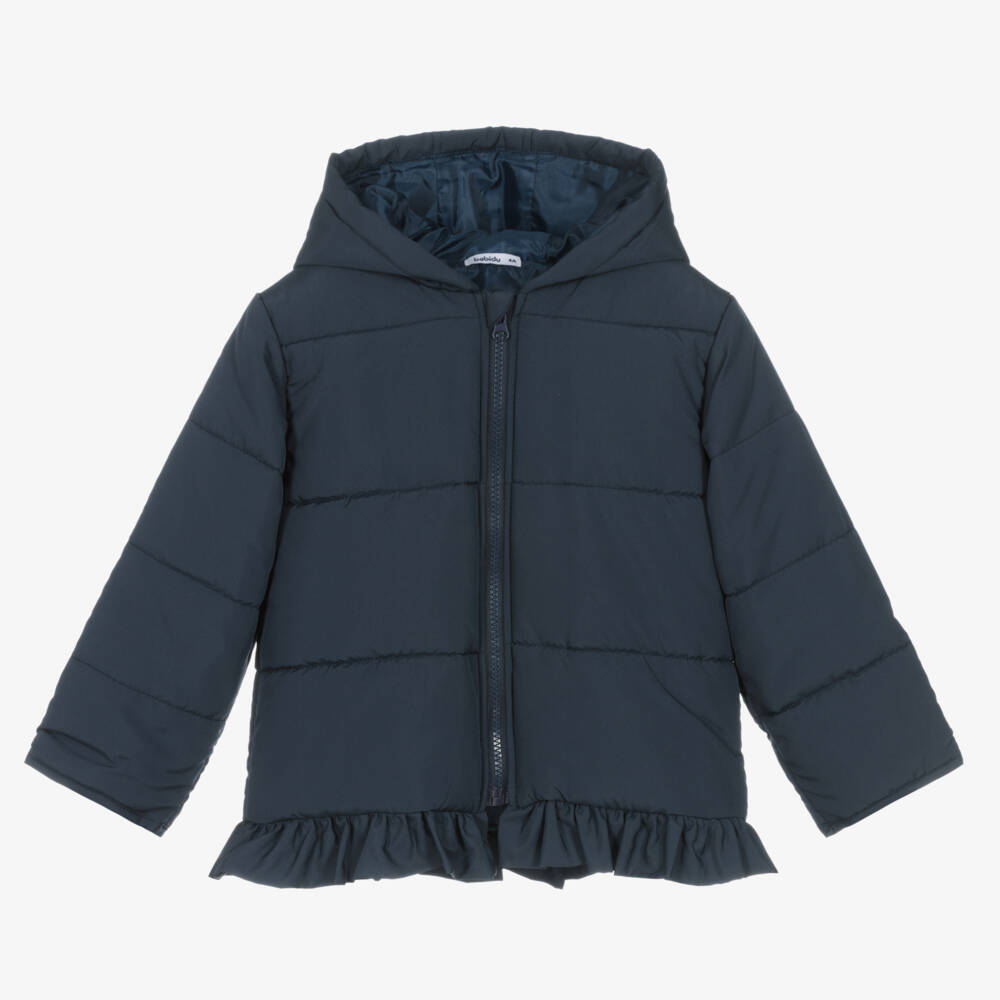 Navy blue puffer jacket for girls by Spanish brand Babidu, with a pretty frilled hem. Made in silky smooth fabric, it is softly padded for comfort and warmth. There is a fixed hood for extra cosiness, with an exposed zip fastening down the front.