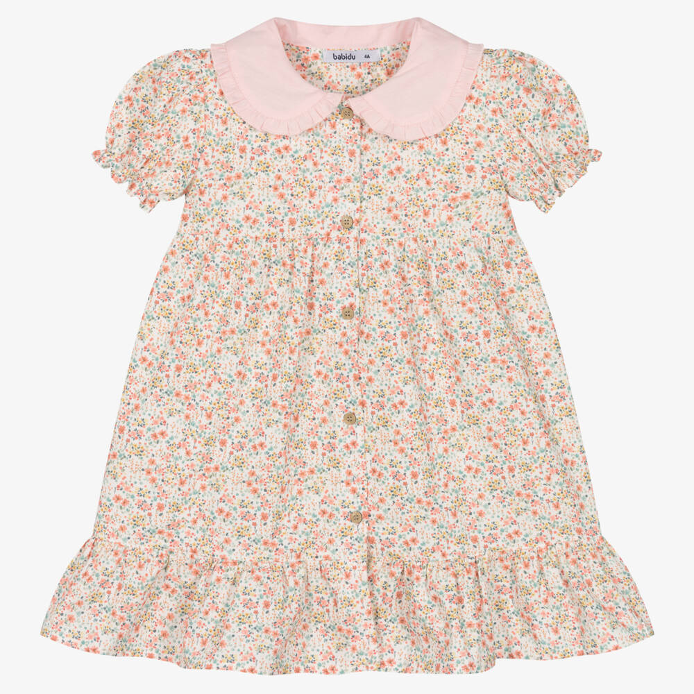 In a lovely orange, yellow and green floral print, this classically styled ivory dress for girls is by Babidu. Woven in soft lightweight cotton, it has pretty puffed sleeves and sweet ruffle trim on the collar and around the hem. Gathered from the bodice, it is easy and comfortable to wear, and fastens with traditional wooden buttons down the front.