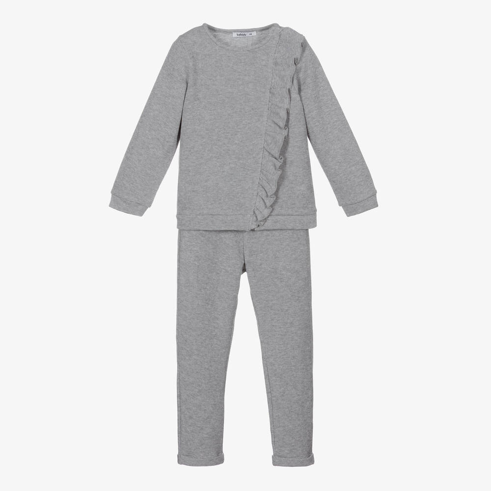 Grey marl tracksuit for girls by Babidu, made in softly ribbed cotton jersey. The top has an asymmetrical ruffle trim on the front, with a concealed zip fastening beneath. The trousers have turn-up hems and an elasticated waist with a faux drawstring.