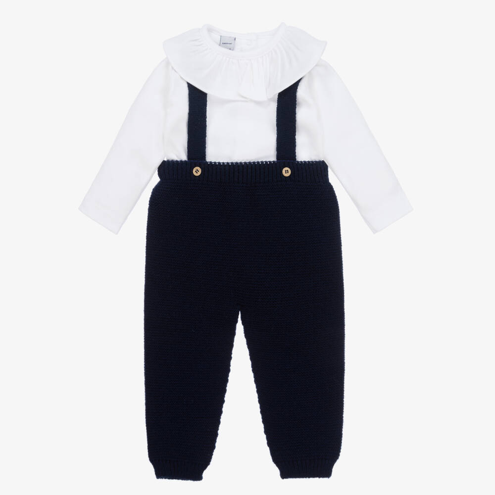 Navy blue trouser set for little girls by classic Spanish brand Babidu. The white bodysuit is made in comfortable cotton jersey, with a large, ruffled collar. It fastens with poppers on the back and between the legs, so always looks tidy and never becomes untucked. The navy blue, softly knitted trousers have cross-over shoulder straps that fasten with buttons and have ribbed trims for cosiness.