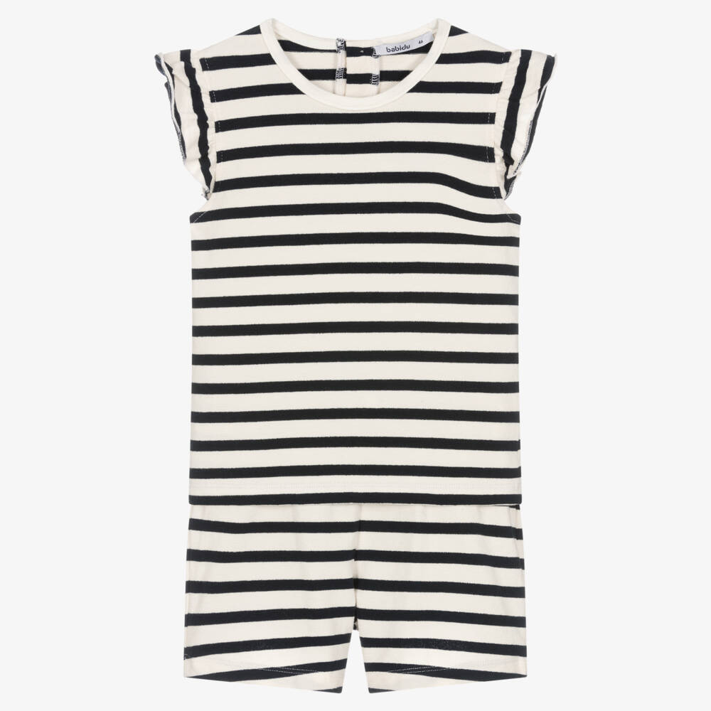 Navy blue and white striped shorts set for younger girls by Babidu, made in a soft, fine cotton knit. Great for casual wear, the T-shirt has capped flutter sleeves, a rounded neckline and two button fastenings on the back. The matching shorts have an elasticated waistband for maximum comfort, along with a faux drawstring fastening on the front and a patch pocket on the back.