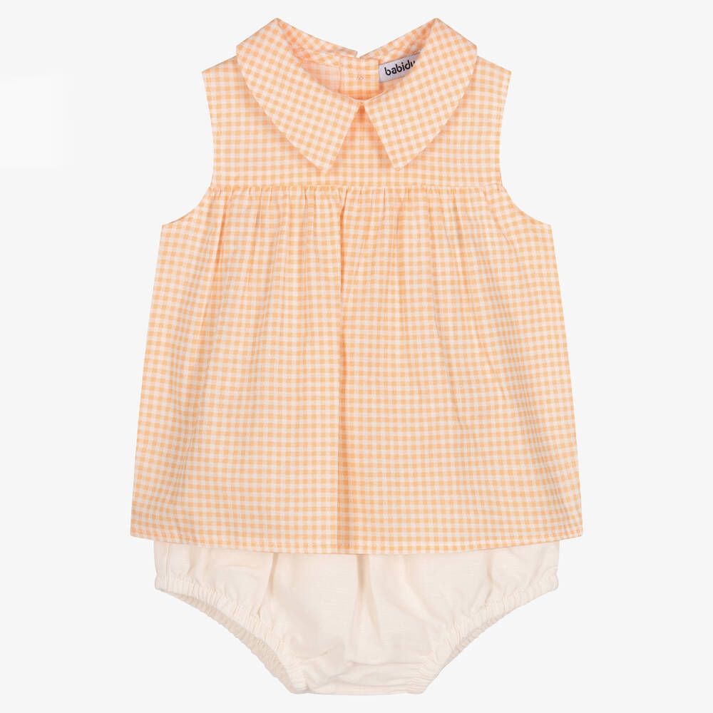 A lovely orange and beige shorts set for little girls by Babidu, made in a soft and lightweight cotton weave. The sleeveless blouse has a pointed collar and brown button fastenings on the back to help with dressing. The light beige bloomer shorts have a sweet, gathered ruffle on the back. They are elasticated on the waist and legs for maximum comfort.