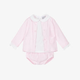 Lovely blue and white cotton shorts set for little boys by Babidu. The white poplin blouse has a sweet Peter Pan collar and pretty ruffles around the gently elasticated cuffs. The pale blue jacket and matching bloomer shorts are made in soft, comfortable piqué. The jacket has cute patch pockets and the shorts have gently elasticated cuffs for comfort.