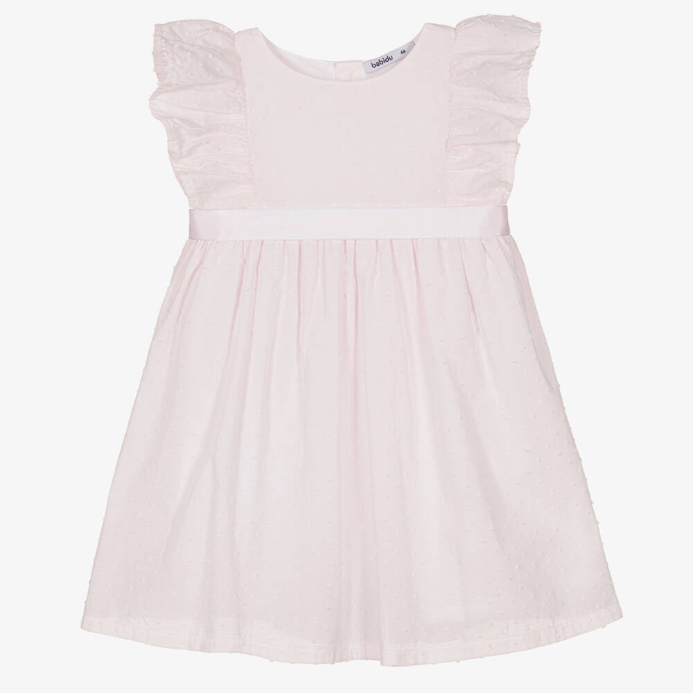 Exclusive to Childrensalon, this charming pale pink dress for girls by Babidu has pretty ruffles around the shoulders. It is made in soft plumeti cotton and has a lightweight voile lining for added comfort. Trimmed with a white grosgrain ribbon sash around the waist, it fastens with traditional mother-of-pearl buttons on the back.