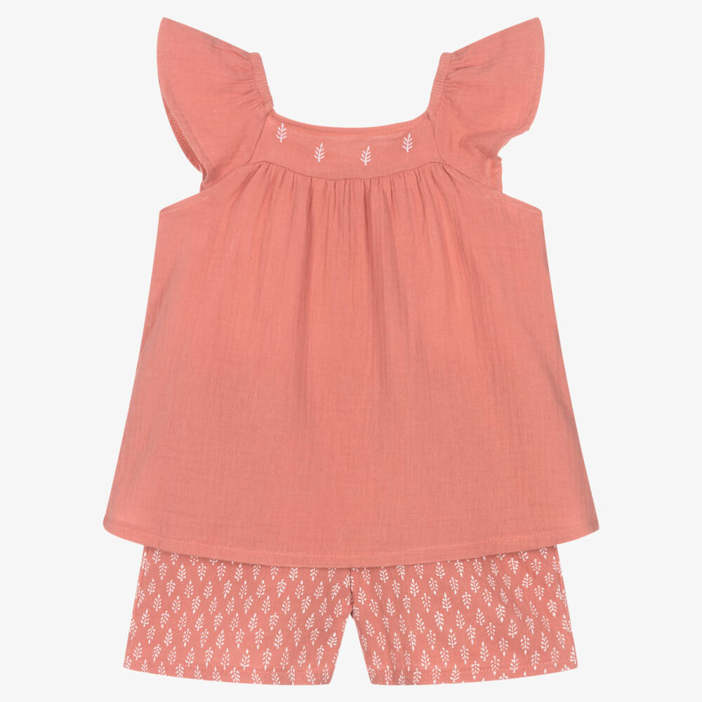 In a lovely shade of terracotta pink, this classically styled top and shorts set for girls is by Babidu. Patterned in a white leafy print, the shorts have pretty ruffles on the front pockets, with a gently elasticated waist for easy pull on. Embroidered with a matching leafy design on the front, the blouse is elasticated over the shoulders and fastens with wooden buttons down the back. Soft and comfortable, both pieces are made in lightweight cotton cheesecloth.