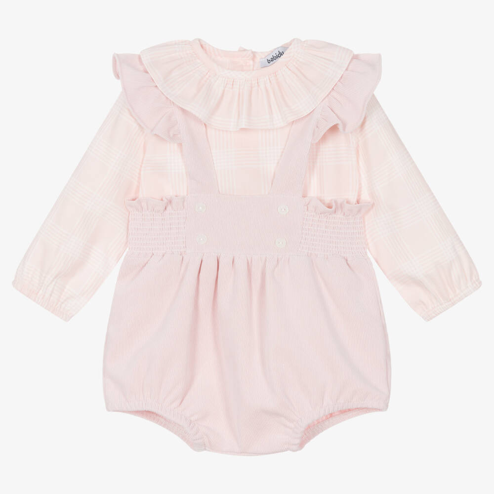 Lovely, traditionally styled pink shorts set for little girls by Spanish brand Babidu. Made in lightweight cotton, the pink check blouse has a pretty ruffle collar, elasticated cuffs and button fastenings on the back. The shorts are made in a fine needlecord with decorative buttons on the front and a comfortable shirred waistband. Fastening on the back with buttons, the shoulder straps have ruffle trims for a sweet finish.