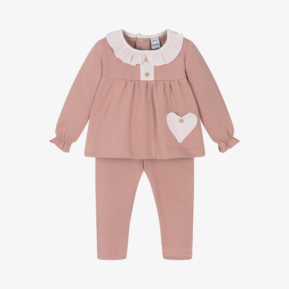 Dusky pink cotton trouser set for little girls by Spanish brand Babidu, made in soft, comfortable jersey with a cosy, fleecy inside. The top has a ruffled, pink and white gingham collar, with matching, decorative detailing on the bodice and a sweet, heart-shaped pocket on the front. There are gently elasticated, frilled cuffs on the long sleeves and popper fastenings on the back. The coordinating trousers have an elasticated waist and are easy to wear, simply pulling up.
